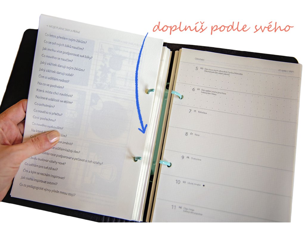Desky už máš z loňska, stačí vyprázdnit (starý obsah uložit či znovu využít), povrch desek omýt a kroužkovou vazbu zde naplnit novou náplní a případně dalšími doplňky. Dál tak můžeš rozvíjet své plány a nápady a navazovat na dosavadní úspěchy. Pedagogický diář, zápisník a kouč Ti připomíná schůzky, úkoly a prázdniny i to, co je ve Tvé profesi důležité – Tvou vizi, jakým učitelem chceš být. Ví, že máš práce až na půdu, a tak Ti pomáhá s lehkostí – k udržitelné efektivitě i pohodě a dává Ti i tvůrčí prostor a pravidelnou inspiraci. Dokonce Ti i podrží věci v běhu na hodinu!