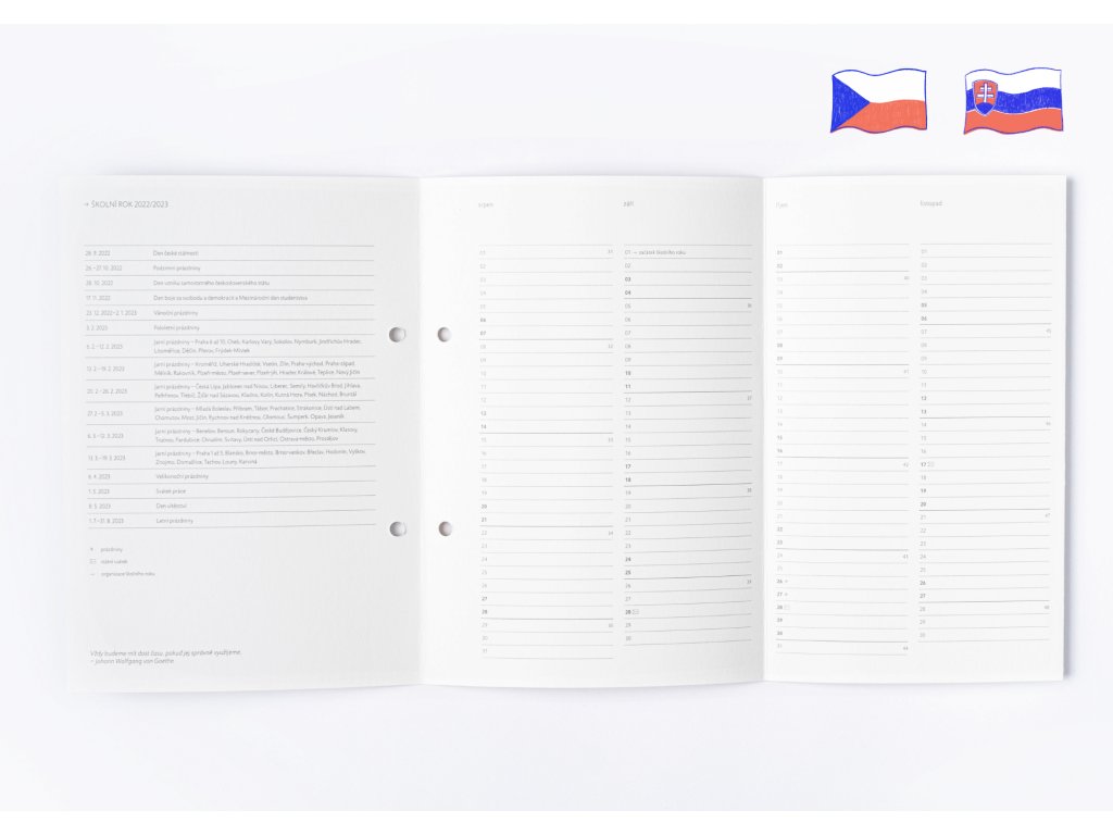 Vyznačili jsme pro Tebe i státní svátky, prázdniny a pedagogicky významná data jako začátek školního roku a podobně; také pro lepší orientaci značíme čísla týdnů.